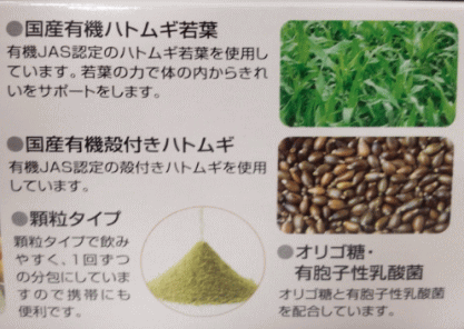 国産有機ハトムギ若葉 有機JAS認定のハトムギ若葉を使用しています。