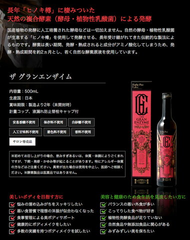 ザ グランエンザイム 内容量:500mL 生産国:日本 賞味期限:製造より2年(未開封時) 計量コップ、液漏れ防止替栓キャップ付 国産の植物原料100種と 豊潤な果実が生み出す「健美」。